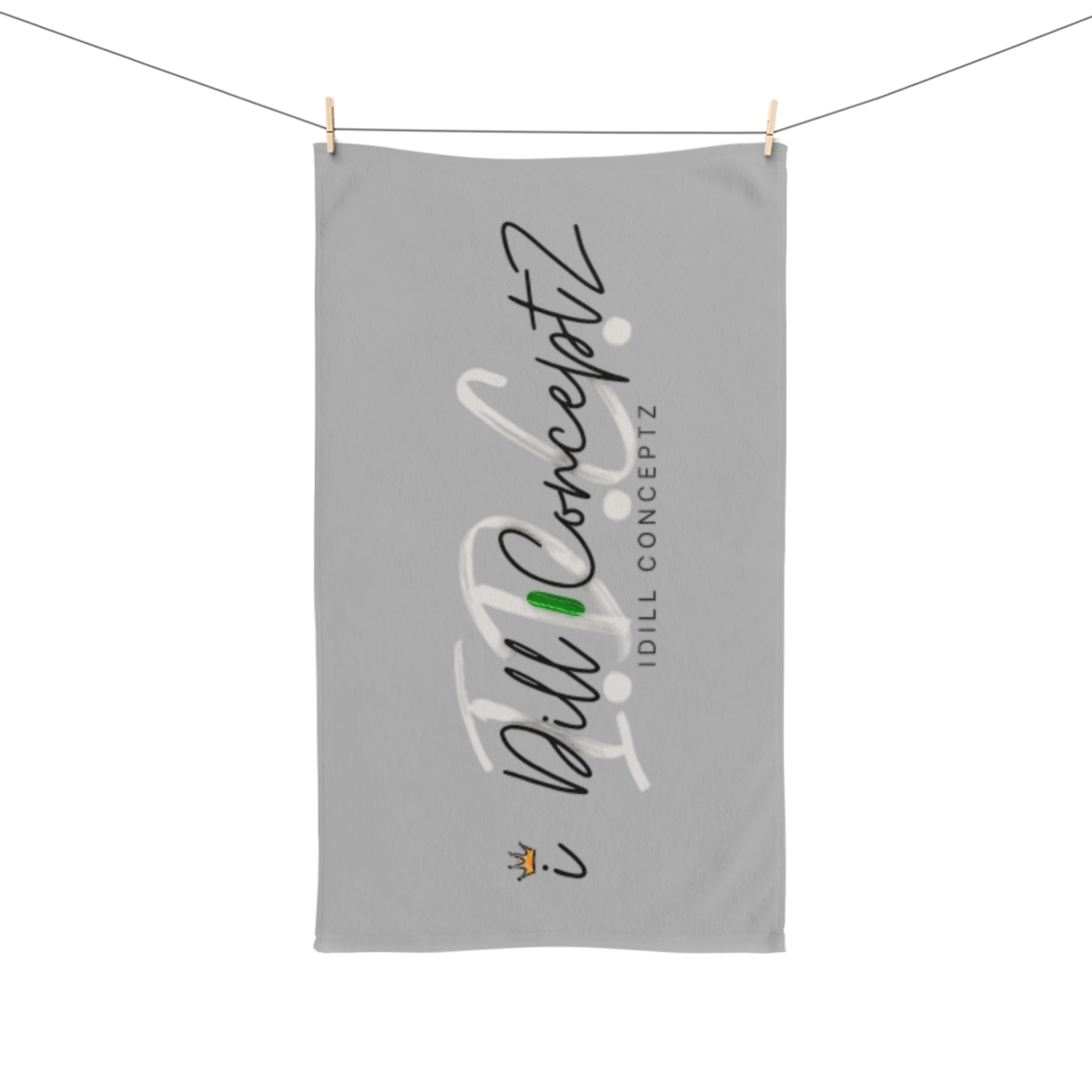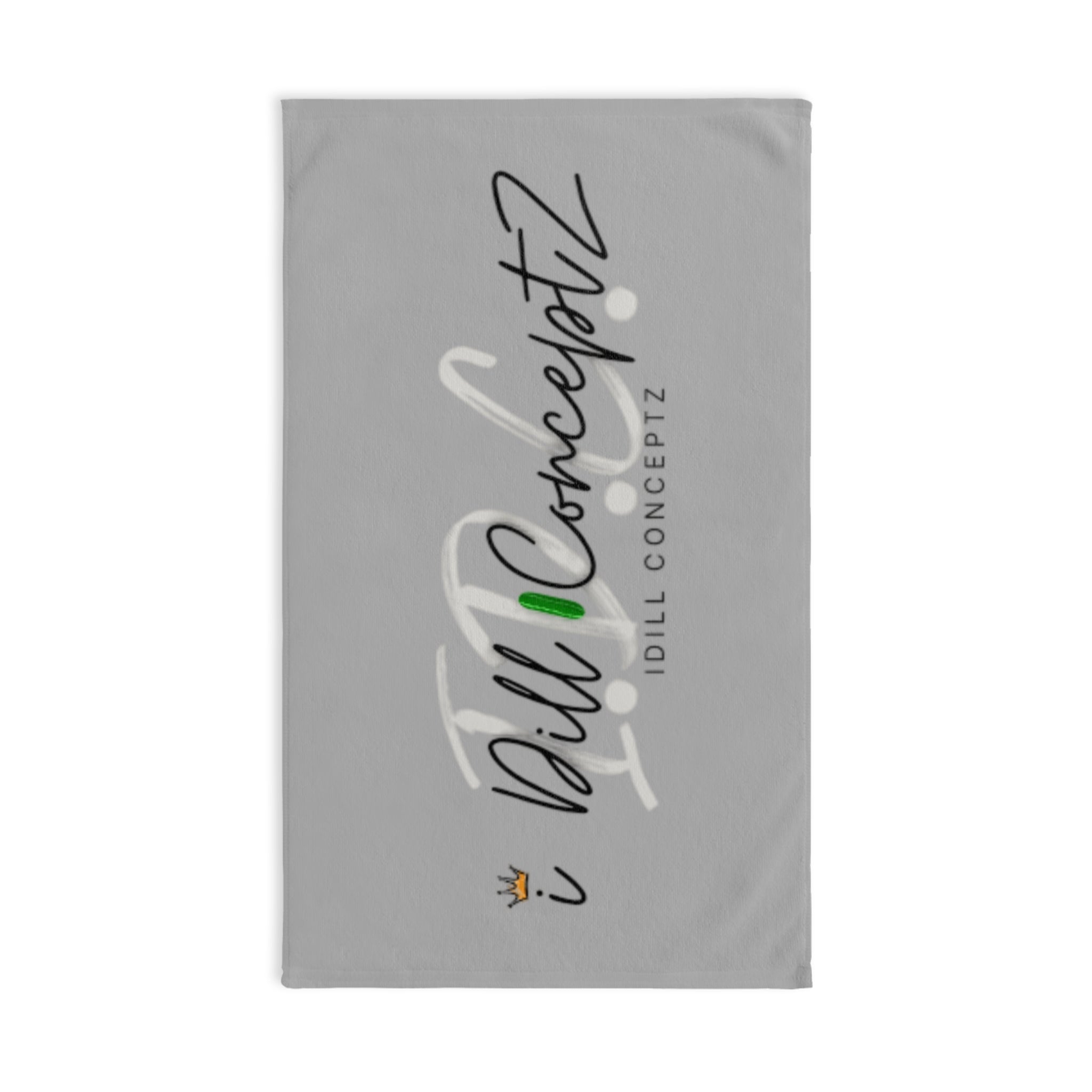 A super soft and lightweight hand towel featuring the iDill Conceptz design, perfect for workouts, sports, and gym enthusiasts. This towel is vibrant, absorbent, and made of durable polyester and cotton blend. It is ideal for athletes looking for a unique and one-of-a-kind towel to add to their workout routine.